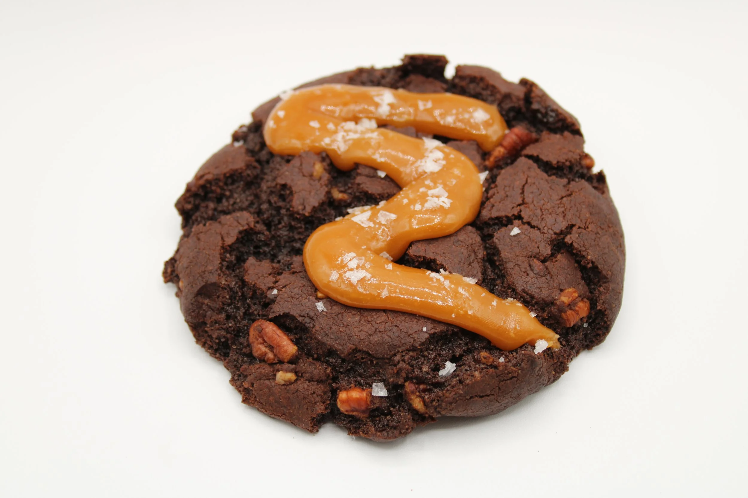 INGREDIENTS: FLOUR, BROWN SUGAR, GRANULATED SUGAR, COCCOA POWDER, CHOCOLATE CHIPS (CANE SUGAR, CHOCOLATE LIQUOR, UNSWEETENED CHOCOLATE, COCOA BUTTER, SOY LECITHIN (AN EMULSIFIER)), CARMEL (WATER, COCONUT OIL, SUNFLOWER OIL, FABA BEAN PROTIEN, GUAR GUM, SUNFLOWER LECITHIN, NATURAL FLAVORS, GRANULATED SUGAR, VEGAN BUTTER, VANILLA EXTRACT), VANILLA EXTRACT, VEGAN BUTTER ( VEGETABLE OIL BLEND: PALM OIL, CANOLA OIL, SOY BEAN OIL, FLAXSEED OIL, WATER, SALT, LESS THAN 2% OF: NATURAL FLAVOR, SOY PROTEIN ISOLATE, OLIVE OIL, ORGANIC SOY LECITHIN, LACTIC ACID, ANNATTO EXTRACT (COLOR)), PECANS, FLAX SEED, WATER, VANILLA EXTRACT (VANILLA EXTRACTIVES IN WATER AND ALCOHOL), BAKING SODA, SALT.